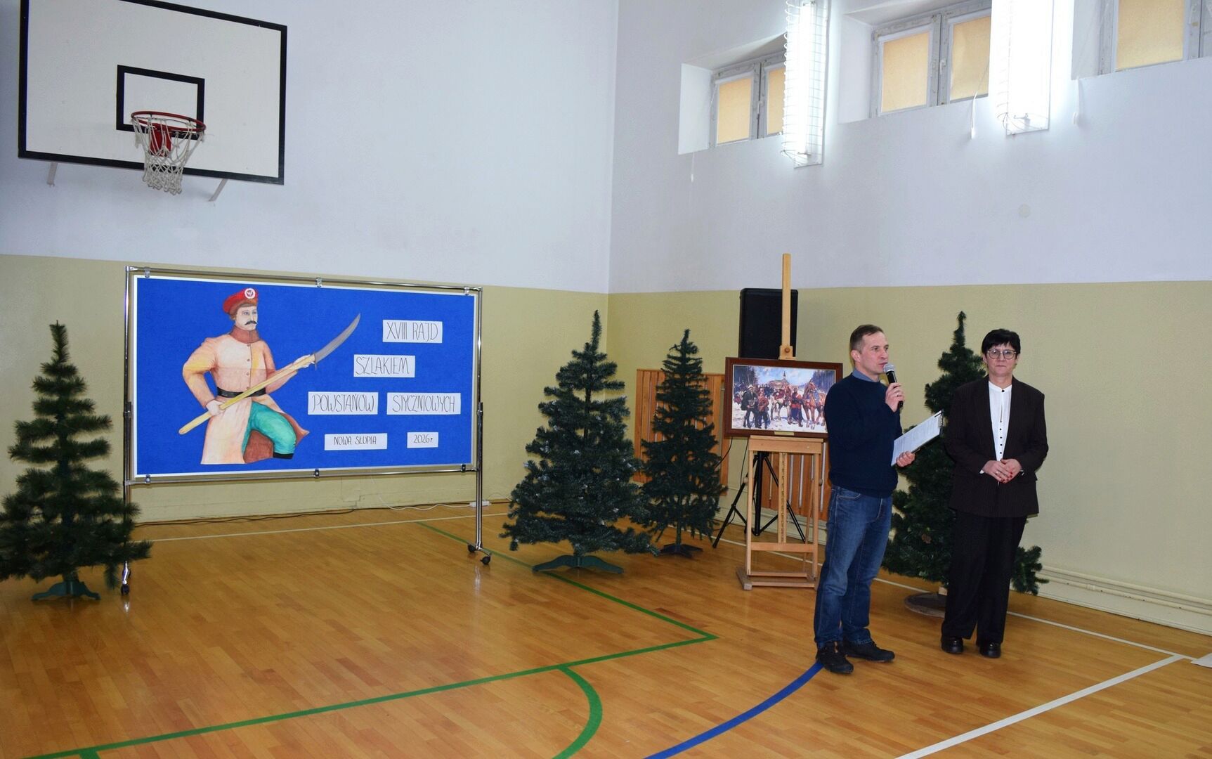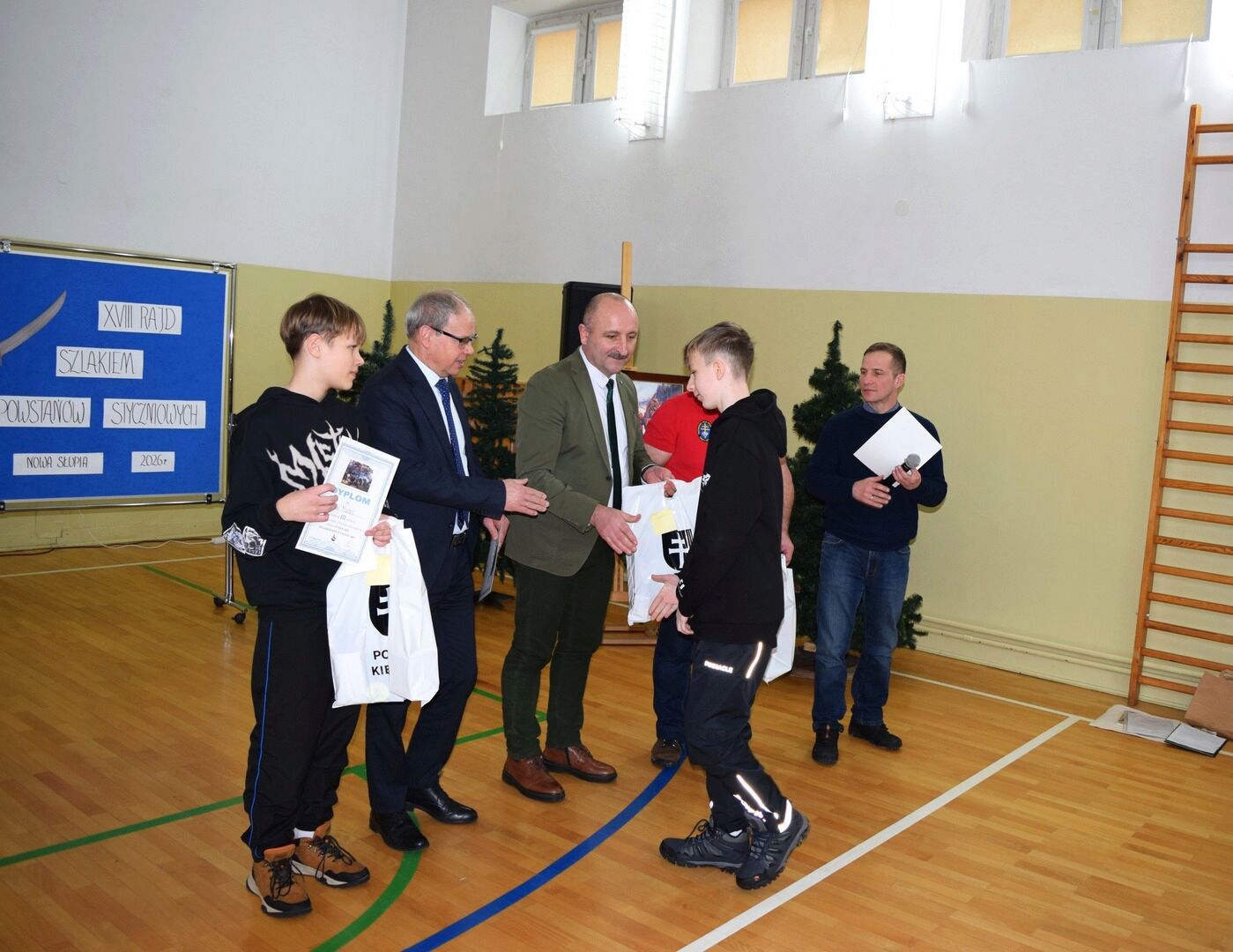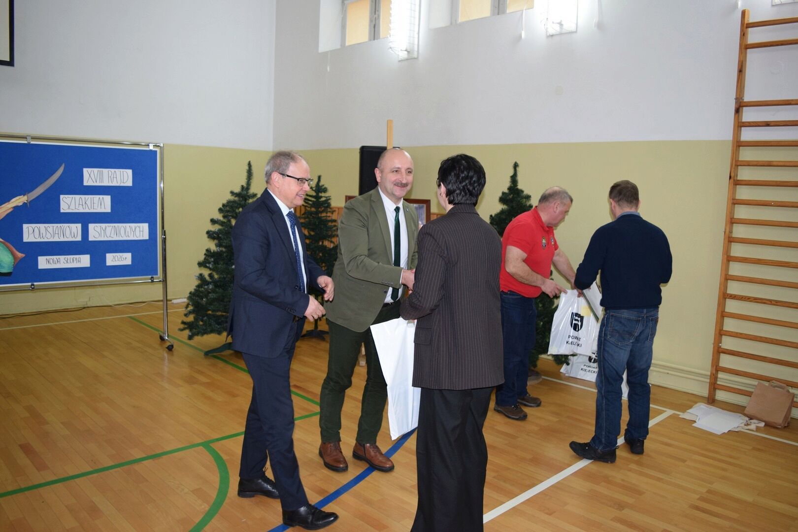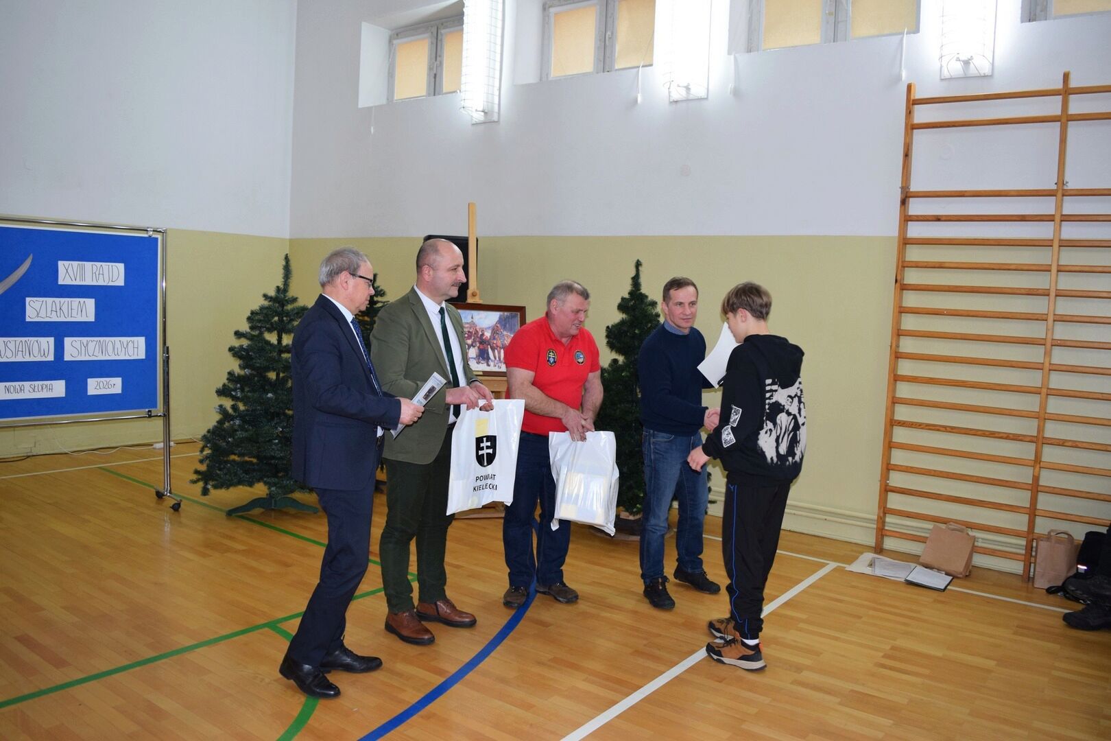 Wszystkich zebranych powitała dyrektor szkoły Renata Storzysz wraz z Piotrem Sepioło – pomysłodawcą i jednym z przewodników Rajdu. Podsumowaniu towarzyszył również konkurs historyczny z wiedzy o Powstaniu Styczniowym. Czas oczekiwania na ogłoszenie wyników umilił zebranym występ uczniów klas VI, VII, VIII przygotowanych przez Pana Jacka Górę. Dodatkową lekcją historii była prezentacja Marka Sieńka - nauczyciela historii, poświęcona zrywowi niepodległościowemu z 1863 roku, który szerokim echem wybrzmiał także w Górach Świętokrzyskich. Z kolejną prezentacją wystąpił Pan Janusz Kędracki – redaktor, honorowy Przewodnik Świętokrzyski, pasjonat i wielki znawca regionu. W kilkunastominutowym wystąpieniu zaprezentował wiele ciekawych informacji związanych ze zrywem z połowy XIX wieku.